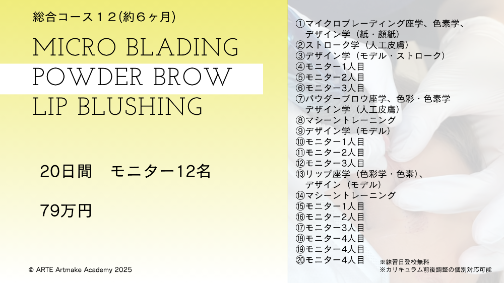 当スクールの総合コースでは、1年をかけて人気のアートメイク手技を学べるプログラムをご用意しています。